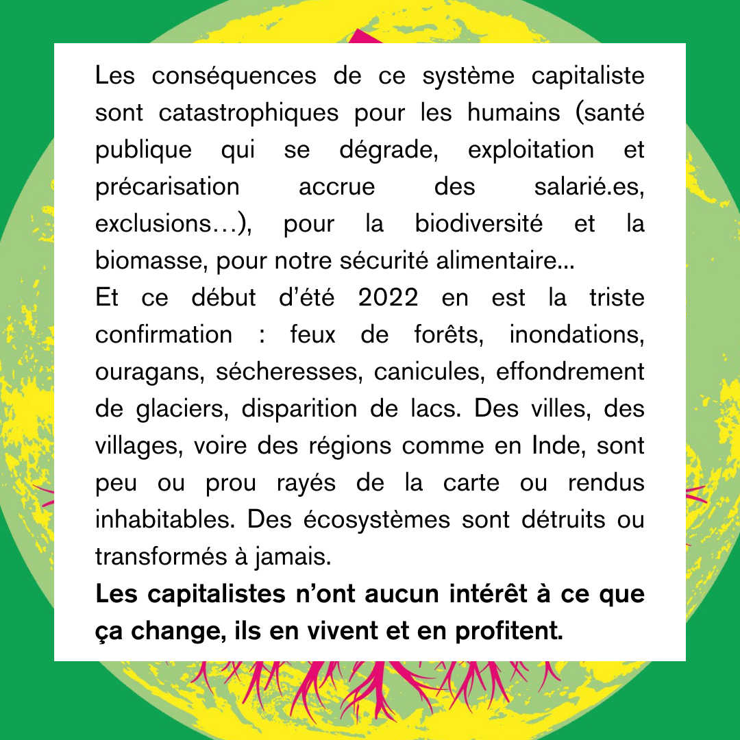 Les conséquences de ce système capitaliste sont catastrophiques pour les humains (santé publique qui se dégrade, exploitation et précarisation accrue des salarié.es, exclusions…), pour la biodiversité et la biomasse, pour notre sécurité alimentaire... Et ce début d’été 2022 en est la triste confirmation : feux de forêts, inondations, ouragans, sécheresses, canicules, effondrement de glaciers, disparition de lacs. Des villes, des villages, voire des régions comme en Inde, sont peu ou prou rayés de la carte ou rendus inhabitables. Des écosystèmes sont détruits ou transformés à jamais.