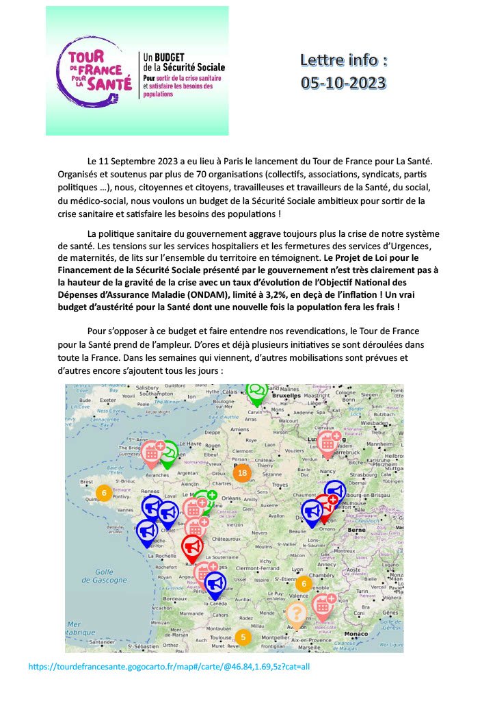 En pièce jointe la lettre d'info de notre Tour de France pour la Santé. A l'occasion du prochain vote du PLFSS, plus de 70 organisations (dont Solidaires et SUD Santé Sociaux) ont lancé un appel à organiser partout où cela est possible des initiatives pour dénoncer la situation de nos secteurs de la Santé, du Social, du Médico-Social.