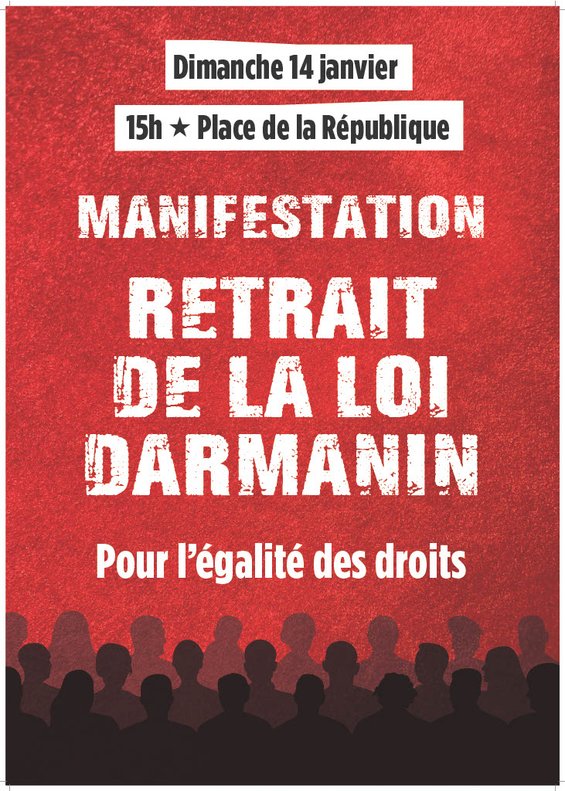 - À manifester massivement sur tout le territoire le dimanche 14 janvier, pour empêcher que cette loi soit promulguée, combattre le racisme, la xénophobie et défendre une politique migratoire d’accueil et de solidarité.
