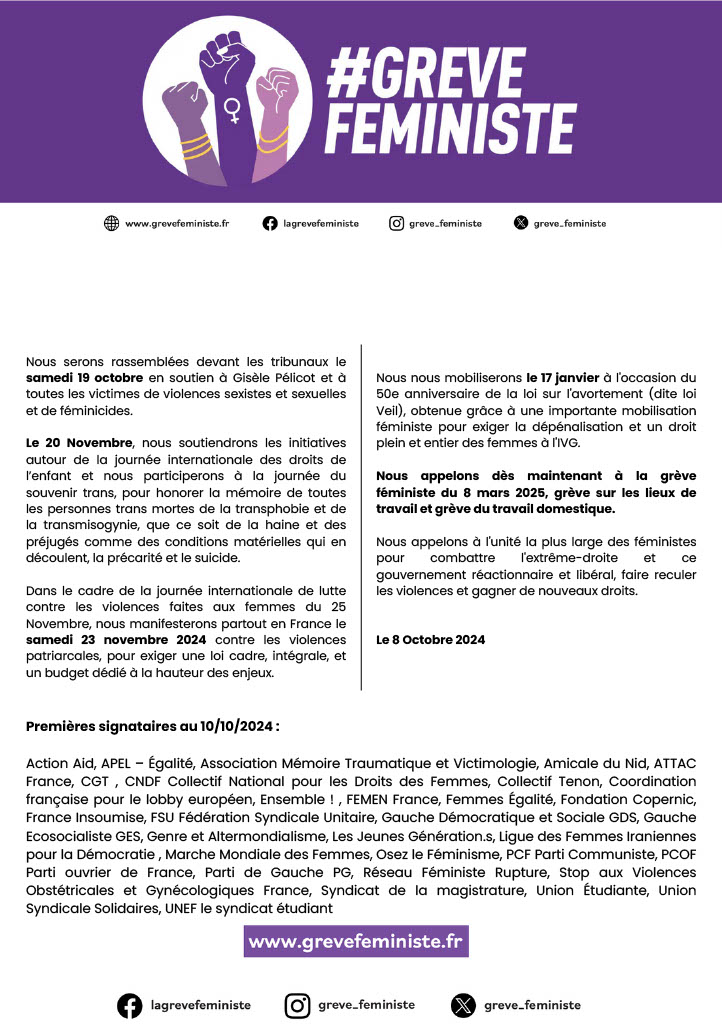 Nous appelons dès maintenant à la grève féministe du 8 mars 2025, grève sur les lieux de travail et grève du travail domestique.