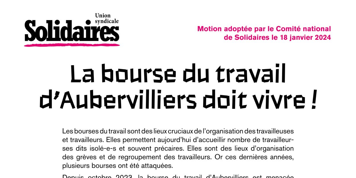 Motion du CN de Solidaires de janvier 2024 - La bourse du travail d’Aubervilliers doit vivre !