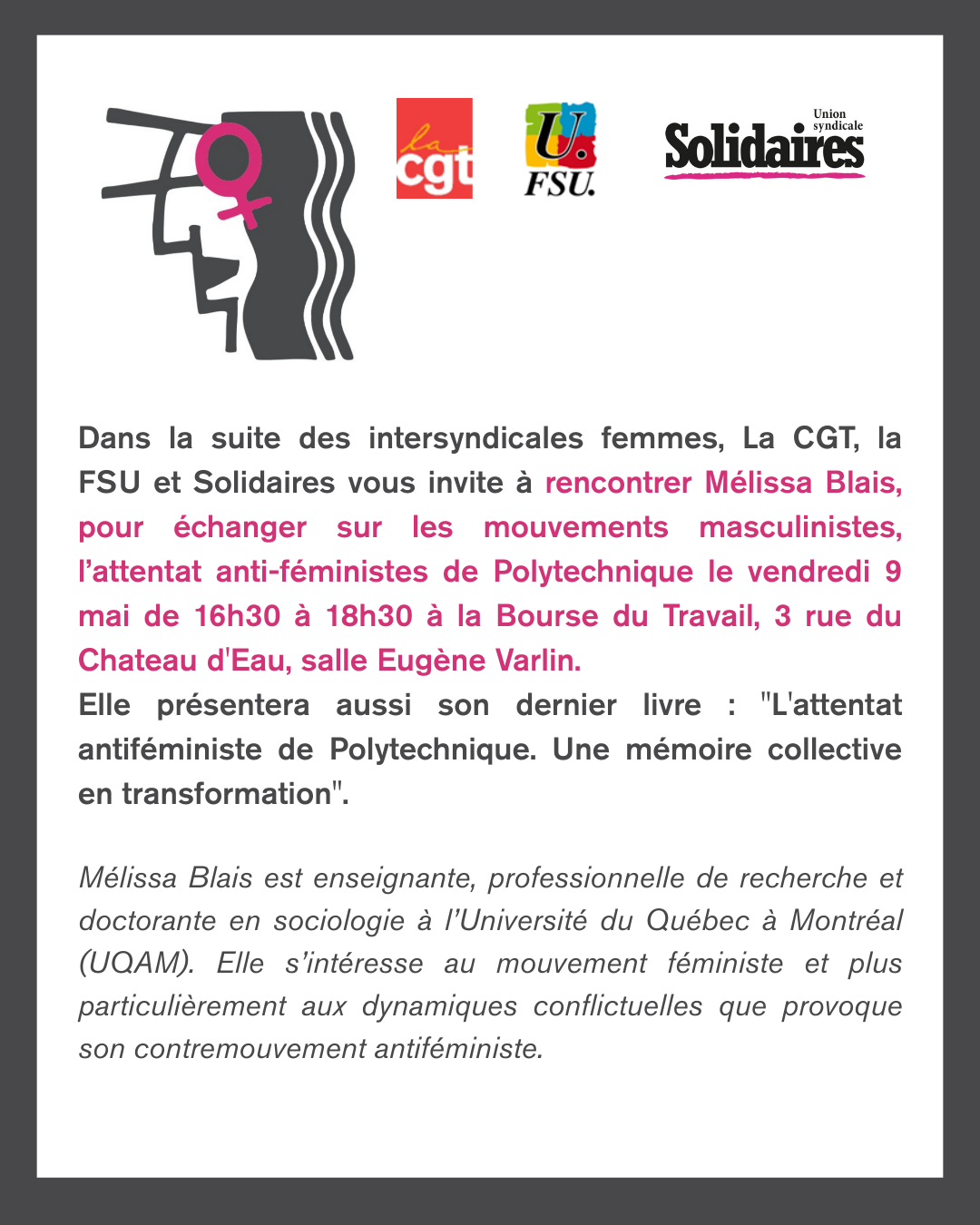 Dans la suite des intersyndicales femmes, la CGT, la FSU et Solidaires vous invite à rencontrer Mélissa Blais pour échanger sur les mouvements masculinistes d'hier et sur l’attentat anti-féministes de Polytechnique, le vendredi 9 mai de 16h30 à 18h30 à la Bourse du Travail, 3 rue du Chateau d'Eau à Paris, salle Eugène Varlin. Elle présentera aussi son dernier livre : "L'attentat antiféministe de Polytechnique. Une mémoire collective en transformation".