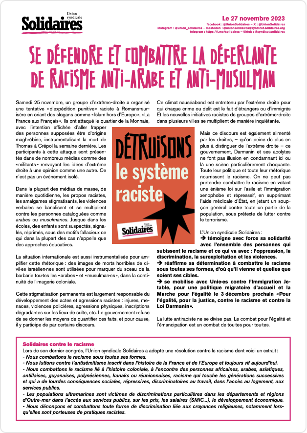 Lors de son dernier congrès, l’Union syndicale Solidaires a adopté une résolution contre le racisme dont voici un extrait :