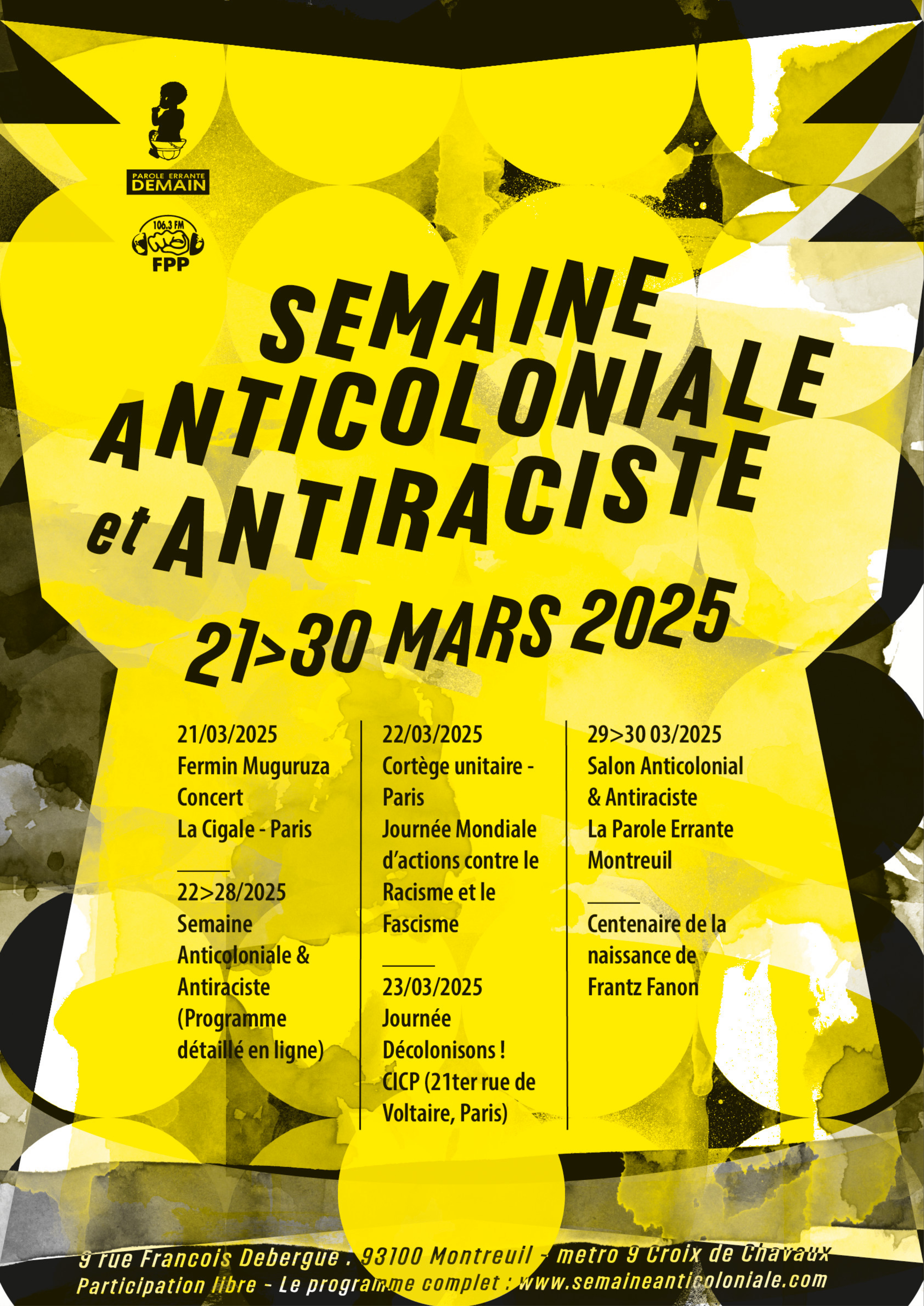 Le lendemain ce sera un samedi 22 mars 2025 combatif ! Nous organisons un grand cortège anticolonial et antiraciste à la manifestation à Paris rejoignant l’appel pour une journée mondiale d’actions contre le racisme et le fascisme, dans les villes du monde entier, au nord comme au sud, et autour de cette date, à l’occasion de la Journée internationale contre le racisme : www.antiracisme-solidarite.org