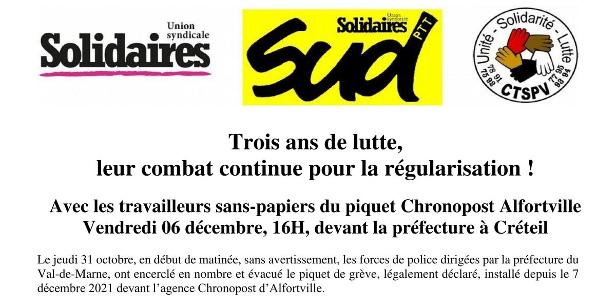 Travailleurs Sans Papiers de Chronopost : 3 ans de lutte, le combat continue pour la régularisation ! rassemblement le 6 décembre à16H