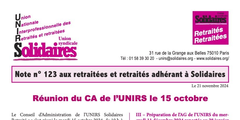 Le Conseil d’Administration de l’UNIRS Solidaires Retraité·e·s s’est réuni le mardi 15 octobre 2024, de 10 h à 16 h au siège de l’Union syndicale Solidaires avec 14 personnes, 6 femmes et 8 hommes. Le compte-rendu complet ainsi que le texte sur le contexte sont consultables sur le site de Solidaires : https://solidaires.org/sinformer-et-agir/actualites-et-mobilisations/sectorielles/compte-rendu-du-ca-de-lunirs-du-10-octobre-2024/
