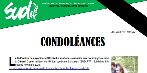 La fédération des syndicats SUD-Rail a souhaité s’associer aux hommages rendus à Gérard Coste, militant de l’Union syndicale Solidaires (SUD PTT, Solidaires 93), décédé le 9 mars 2024.
