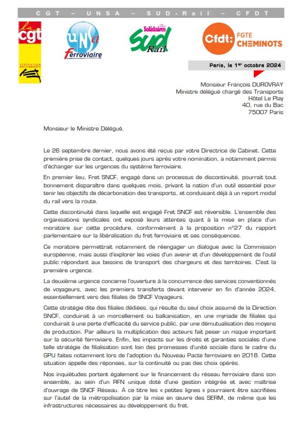 Les fédérations cheminotes CGT - UNSA - SUD-Rail - CFDT exigent de rencontrer à brève échéance le ministre des Transports pour aborder l’ensemble de nos exigences sociales.