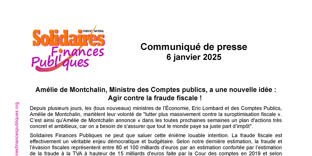 Solidaires Finances Publiques ne peut que saluer cette énième louable intention. La fraude fiscale est effectivement un véritable enjeu démocratique et budgétaire. Selon notre dernière estimation, la fraude et l’évasion fiscales représentent entre 80 et 100 milliards d’euros par an estimation confortée par l’estimation de la fraude à la TVA à hauteur de 15 milliards d'euros faite par la Cour des comptes en 2019 et selon l’Insee en 2022 à 20 et 25 milliards d’euros.