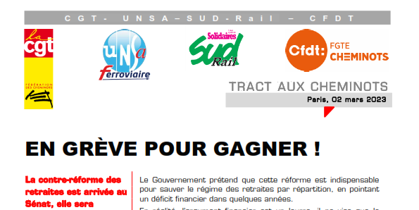 En s’appuyant sur une unité offensive dans le ferroviaire et conscientes de la mobilisation massive interprofessionnelle qui démarrera la semaine prochaine, à l’appui de l’opinion publique, les fédérations cheminotes CGT Cheminots, UNSA-Ferroviaire, SUD-Rail et CFDT Cheminots appellent tous les cheminots de la SNCF et de la branche ferroviaire à se mettre en grève reconductible par période de 24 heures dès le 07 mars et jusqu’à l’abandon du projet de réforme des retraites. Nous demandons aux cheminots de participer très massivement aux assemblées générales organisées sur l’ensemble du territoire.