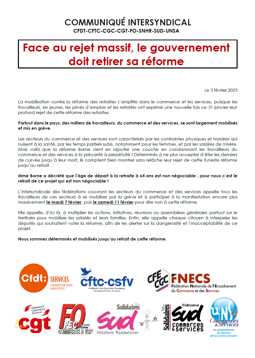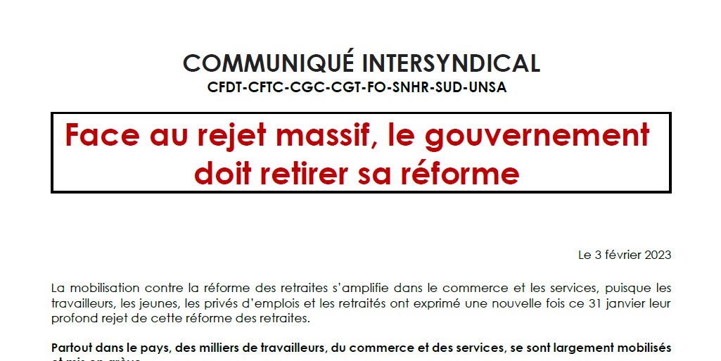 L’intersyndicale des fédérations couvrant les secteurs du commerce et des services appelle tous les travailleurs de ces secteurs à se mobiliser par la grève et à participer à la manifestation encore plus massivement le mardi 7 février, puis le samedi 11 février pour dire non à cette réforme.