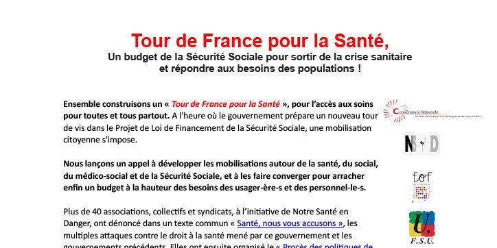 Ensemble construisons un « Tour de France pour la Santé », pour l’accès aux soins pour toutes et tous partout. A l'heure où le gouvernement prépare un nouveau tour de vis dans le Projet de Loi de Financement de la Sécurité Sociale, une mobilisation citoyenne s'impose.