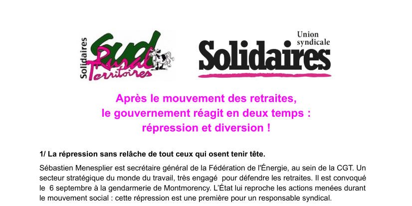 Sébastien Menesplier est secrétaire général de la Fédération de l’Énergie, au sein de la CGT. Un secteur stratégique du monde du travail, très engagé pour défendre les retraites. Il est convoqué le 6 septembre à la gendarmerie de Montmorency. L’État lui reproche les actions menées durant le mouvement social : cette répression est une première pour un responsable syndical.