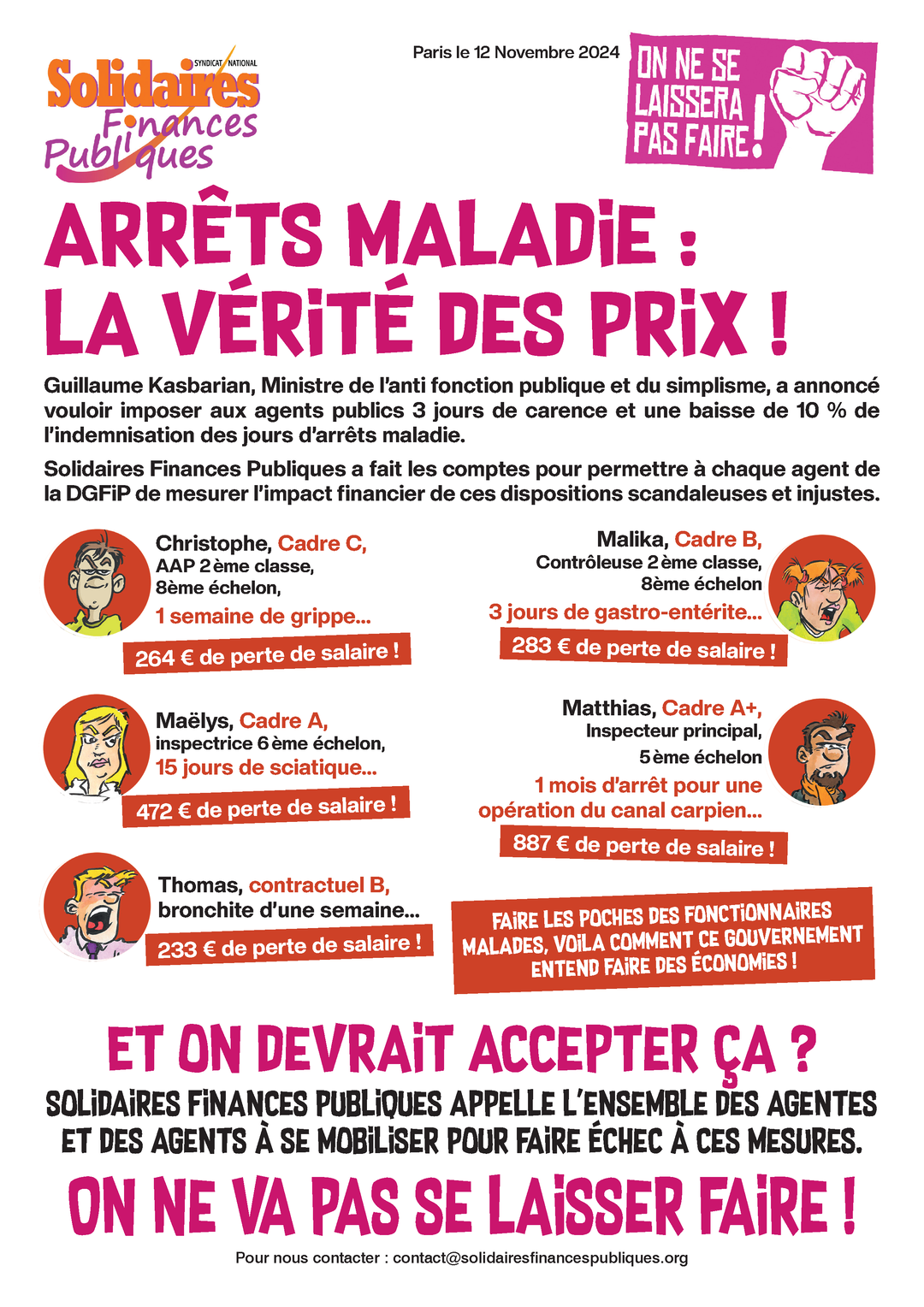 Guillaume Kasbarian, Ministre de l’anti fonction publique et du simplisme, a annoncé vouloir imposer aux agents publics 3 jours de carence et une baisse de 10 % de l’indemnisation des jours d’arrêts maladie. Solidaires Finances Publiques a fait les comptes pour permettre à chaque agent de la DGFiP de mesurer l’impact financier de ces dispositions scandaleuses et injustes.