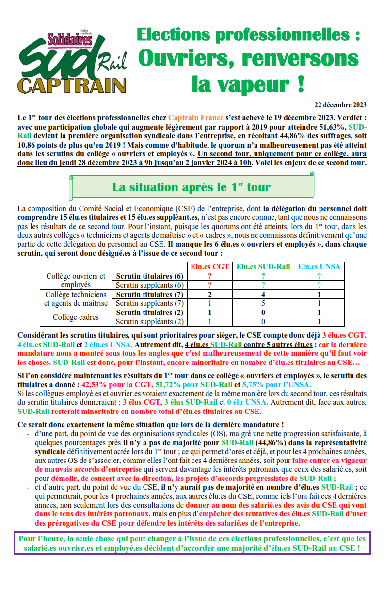 Mais comme d’habitude, le quorum n'a malheureusement pas été atteint dans les scrutins du collège « ouvriers et employés ». Un second tour, uniquement pour ce collège, aura donc lieu du jeudi 28 décembre 2023 à 9 h jusqu'au 2 janvier 2024 à 10h. Dans ce tract, vous trouverez les enjeux de ce second tour.