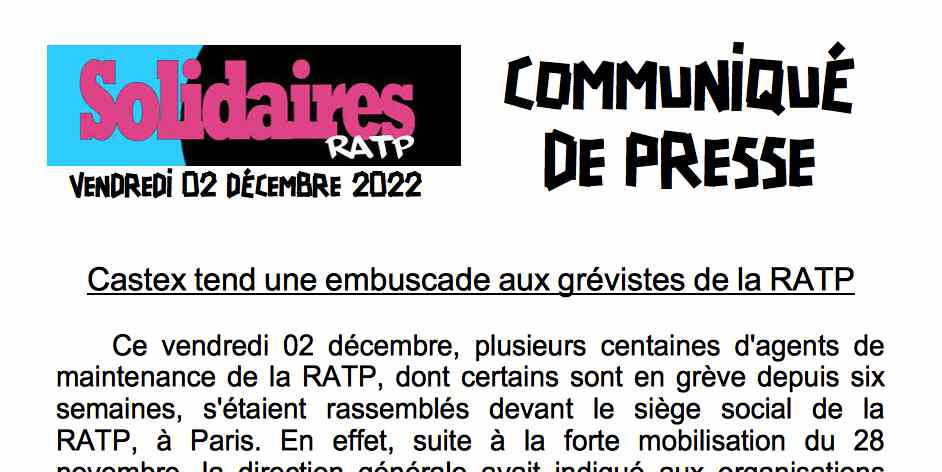 Castex tend une embuscade aux grévistes de la RATP : après leur avoir annoncé mardi qu'il les recevrait aujourd'hui 02 décembre, il annule les audiences au dernier moment, barricade le siège social de l'entreprise, et envoie les forces de répression cogner et gazer les grévistes.