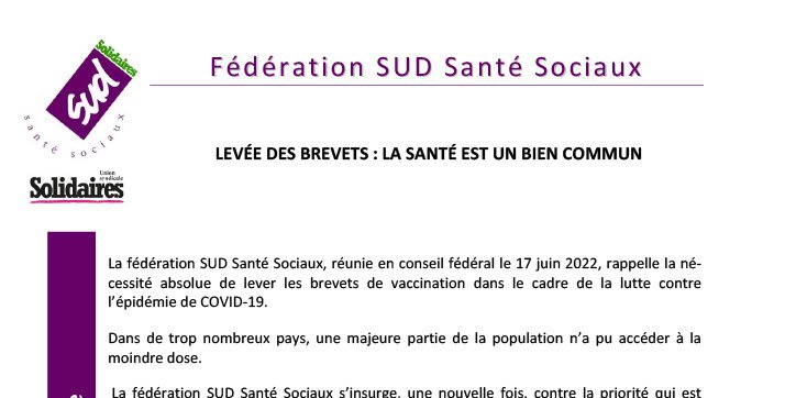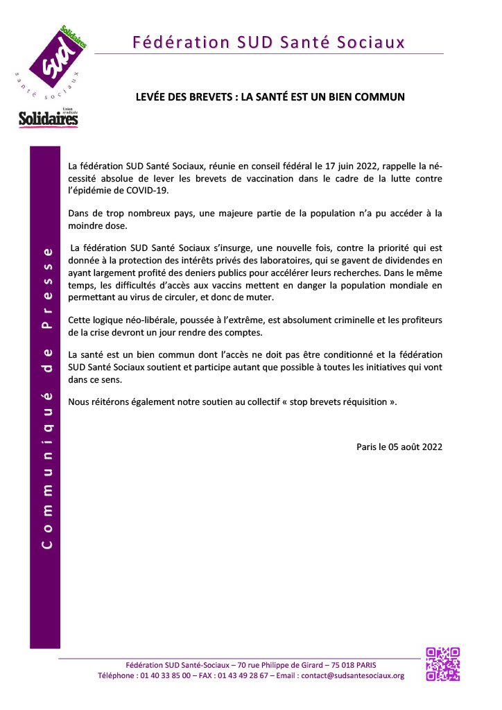 La fédération SUD Santé Sociaux, réunie en conseil fédéral le 17 juin 2022, rappelle la nécessité absolue de lever les brevets de vaccination dans le cadre de la lutte contre l’épidémie de COVID-19.
