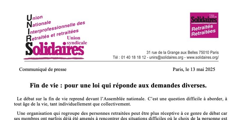 L’Union Nationale Interprofessionnelle des Retraitées et Retraités Solidaires (UNIRS) constate que les groupes ou les individus qui refusent d’élargir la législation française dans ce domaine en prétextant leur « attachement à la vie » sont parfois ceux qui, dans le même temps, privilégient partout l’accaparement des profits au détriment de la vie, militent pour la réduction des dépenses publiques de sécurité sociale, ferment des maternités, des crèches, des hôpitaux, des services de gériatrie, etc.