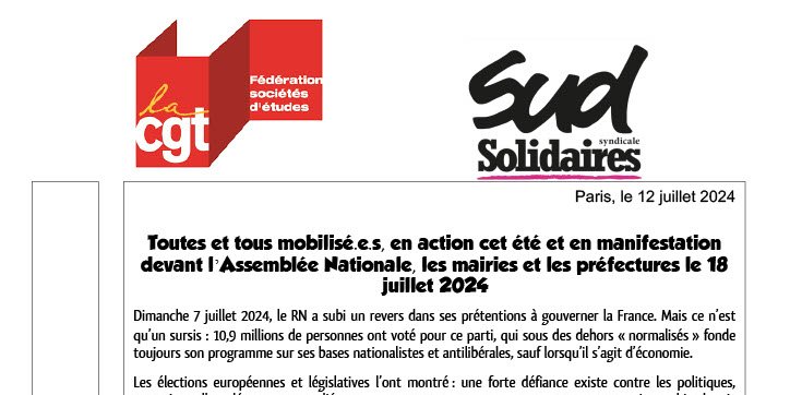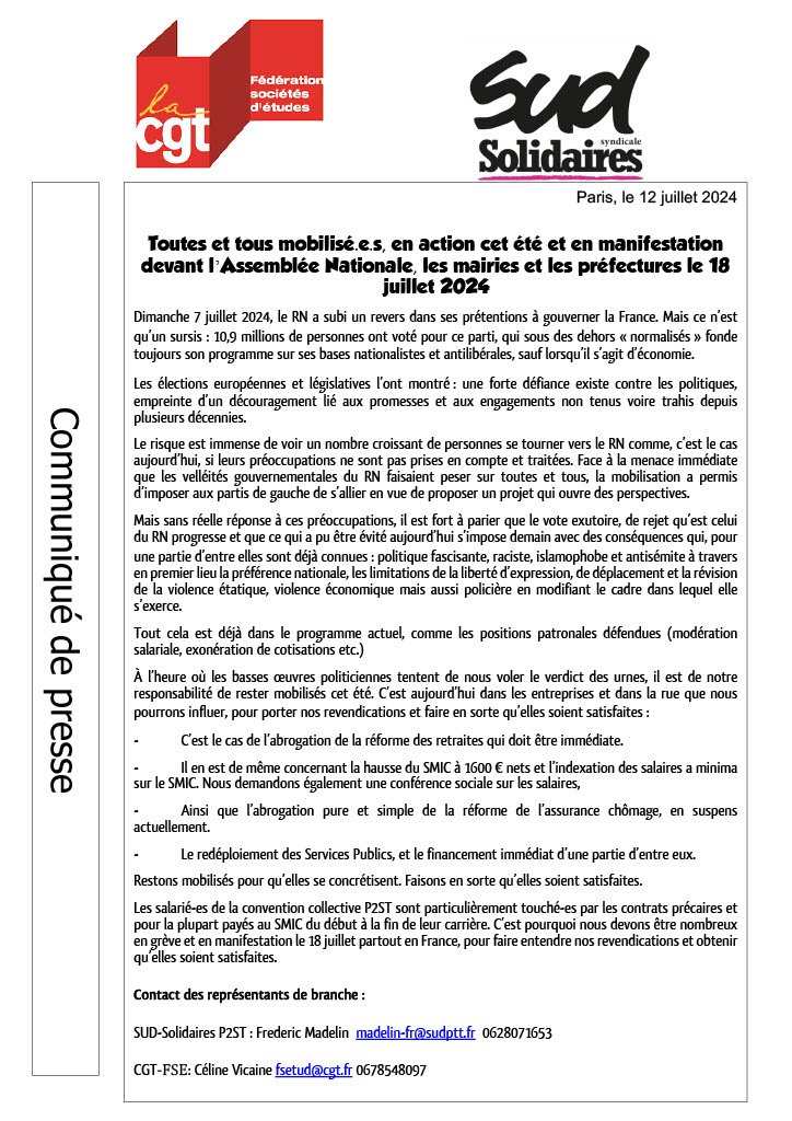 communiqué de presse P2ST CGT - SUD : Toutes et tous mobilisé.e.s, en action cet été et en manifestation devant l ’Assemblée Nationale, les mairies et les préfectures le 18 juillet 2024