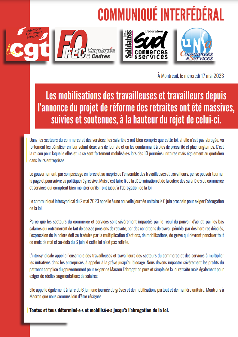 L’intersyndicale appelle l’ensemble des travailleuses et travailleurs des secteurs du commerce et des services à multiplier les initiatives dans les entreprises, à appeler à la grève jusqu’au blocage. Nous devons impacter sévèrement les profits du patronat complice du gouvernement pour exiger de Macron l’abrogation pure et simple de la loi retraite mais également pour exiger de réelles augmentations de salaires.