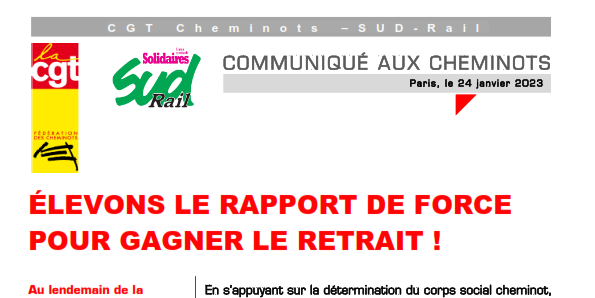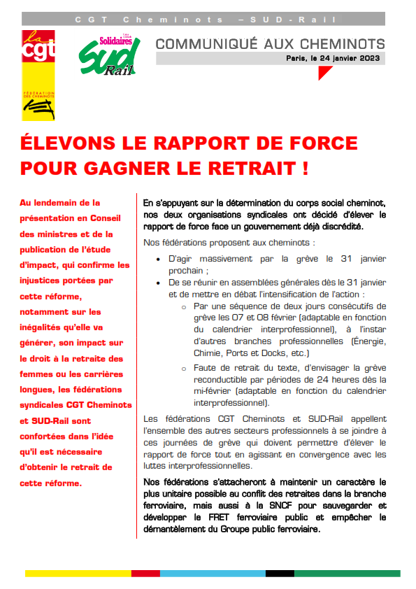 Au lendemain de la présentation en Conseil des ministres et de la publication de l’étude d’impact, qui confirme les injustices portées par cette réforme, notamment sur les inégalités qu’elle va générer, son impact sur le droit à la retraite des femmes ou les carrières longues, les fédérations syndicales CGT Cheminots et SUD-Rail sont confortées dans l’idée qu’il est nécessaire d’obtenir le retrait de cette réforme.
