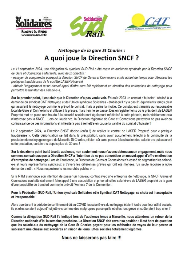 Pour la Fédération SUD-Rail, l’Union syndicale Solidaires et le Syndicat CAT Nettoyage, ce choix est inacceptable et irresponsable !
