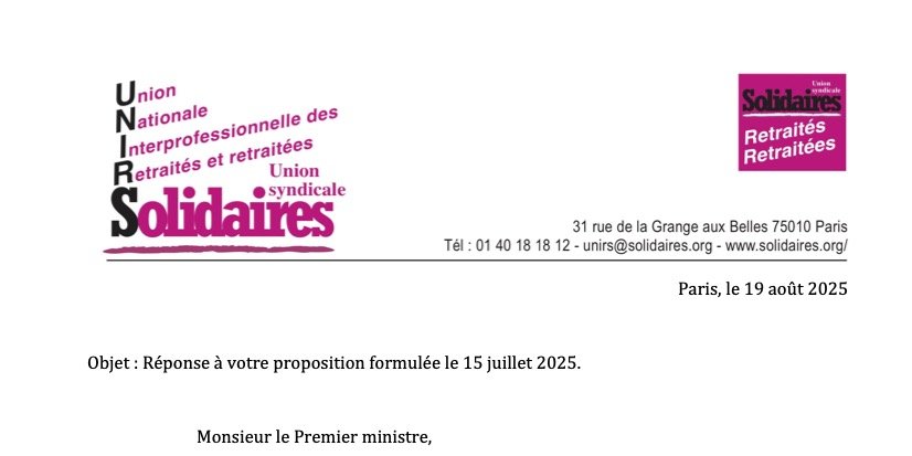 Ce jour, mardi 19 août 2025, l’UNIRS vient d’adresser un courrier au Premier ministre suite à l’invitation faite par le 1er Ministre lui-même lors de sa conférence de presse du 15 juillet 2025 au cours de laquelle il a présenté les caractéristiques de son programme gouvernemental pour 2026, principalement quant au PLF 2026 et au PLFSS 2026. L’UNIRS y exprime ses propositions d’autres voies à suivre pour « redresser les finances publiques ». Il s’agit particulièrement de ne plus suivre les orientations prises par les gouvernements depuis plusieurs décennies, et notamment depuis 2017, et qui ont conduit le pays à la situation actuelle.