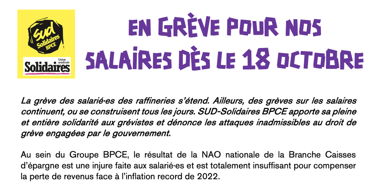 La grève des salarié·es des raffineries s’étend. Ailleurs, des grèves sur les salaires continuent, ou se construisent tous les jours. SUD-Solidaires BPCE apporte sa pleine et entière solidarité aux grévistes et dénonce les attaques inadmissibles au droit de grève engagées par le gouvernement.