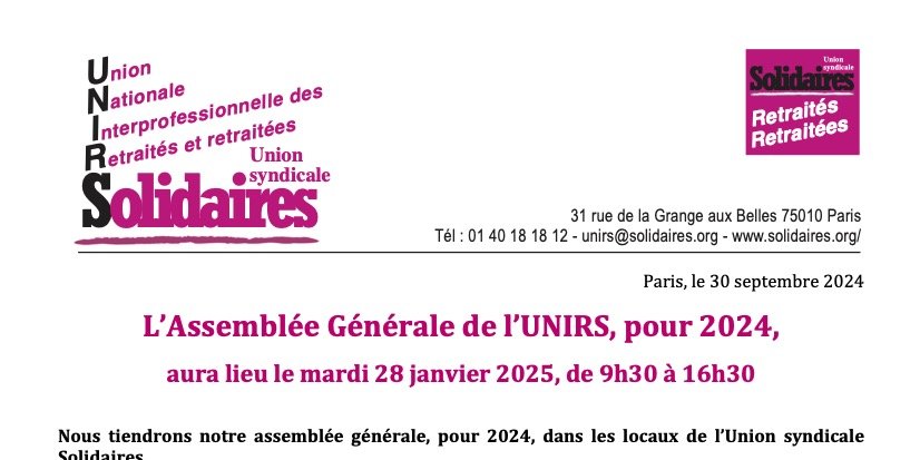 Attention, l'Assemblée Générale 2024 de l'Unirs, prévue le 11 décembre 2024 (jour du début de la grève reconductible à la SNCF), est reportée au 28 janvier 2025. Voici l'ordre du jour avec la nouvelle feuille d'inscription, ainsi que les textes qui seront discutés et votés :