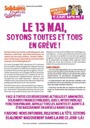 A la DGFiP, alors qu’on nous promettait une « pause », les nouvelles suppressions d’emplois (550 au final), les « économies » demandées dans tous les services, la fin des mouvements locaux pour les cadres A, les attaques ici ou là contre le télétravail, le dialogue social méprisé..., ne font que mettre à mal l’exercice de nos missions et amplifient le mal-être des agentes et agents ! De plus, le Gouvernement, dans le cadre de la préparation du budget 2026, organise d’ores et déjà une revue des missions et des arbitrages, ciblant de nouveau les fonctionnaires !