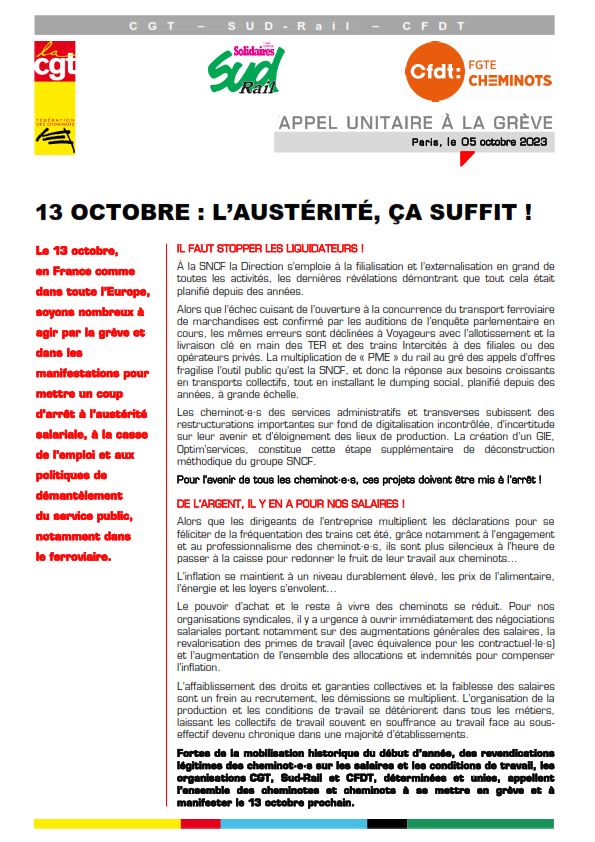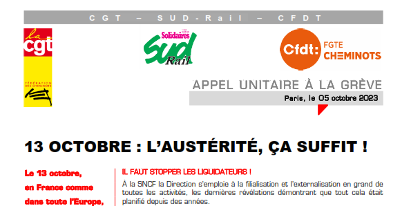 Le 13 octobre, en France comme dans toute l’Europe, soyons nombreux à agir par la grève et dans les manifestations pour mettre un coup d’arrêt à l’austérité salariale, à la casse de l’emploi et aux politiques de démantèlement du service public, notamment dans le ferroviaire.