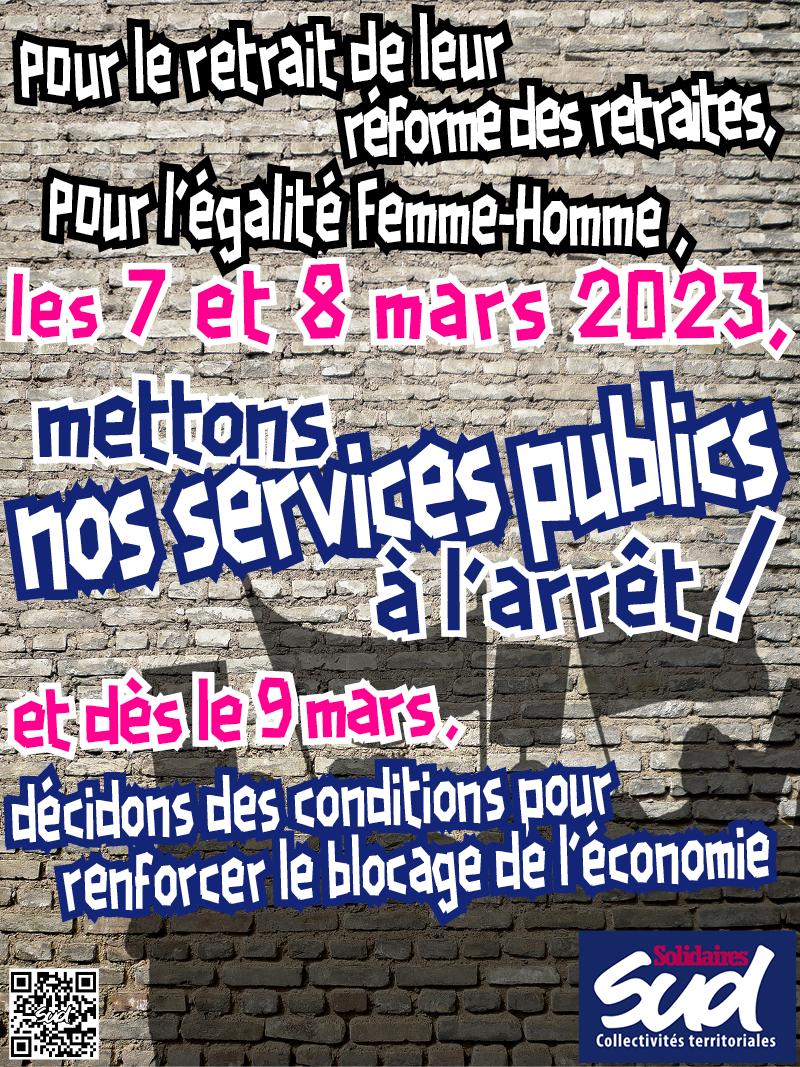Pour le retrait de la réforme des retraites, pour l’égalité femme/homme, les 7 et 8 mars mettons nos services publics à l’arrêt ! et dès le 9 mars décidons des conditions pour renforcer le blocage de l’économie.