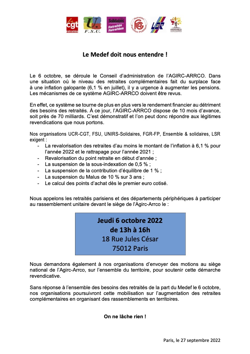 Et l'appel de 6 organisations à un rassemblement le 6 octobre à 13 h pour la revalorisation des pensions complémentaires Agirc-Arrco.