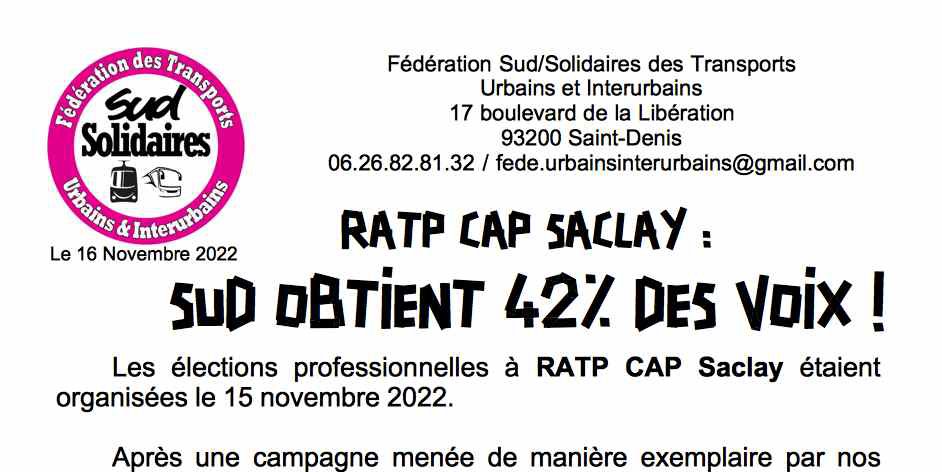 Les élections professionnelles à RATP CAP Saclay ont eu lieu le 15 novembre 2022. Les listes présentées par la fédération Sud/Solidaires des Transports Urbains et Interurbains sont arrivées largement en tête.
