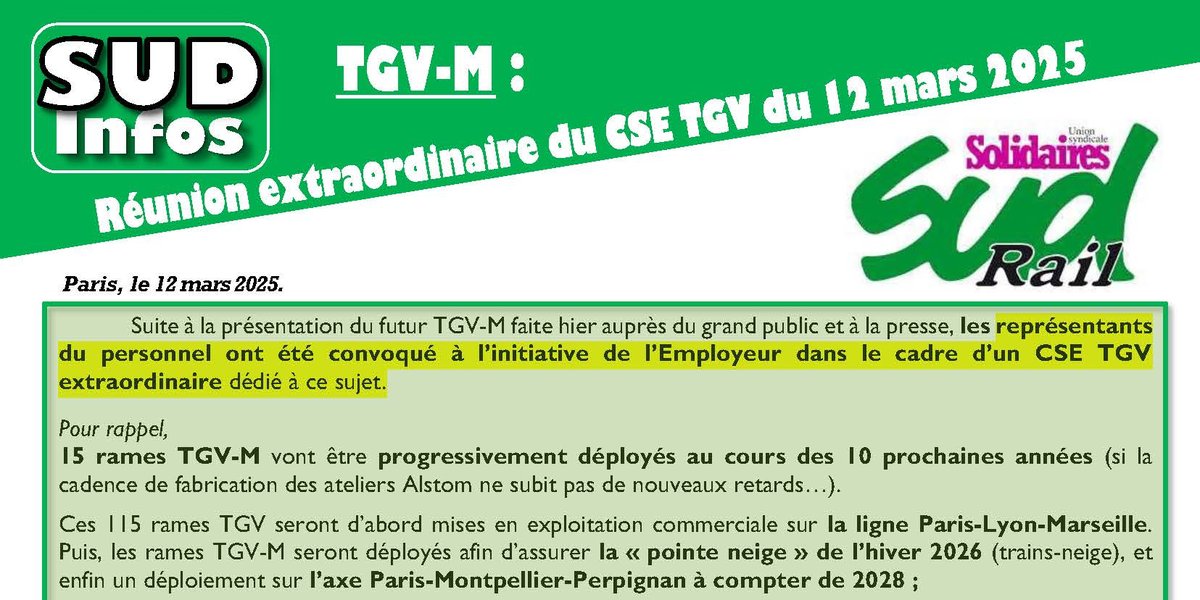 Suite à la présentation du futur TGV-M, faitele 11 mars auprès du grand public et à la presse, les représentants du personnel ont été convoqués à l’initiative de l’Employeur dans le cadre d’un CSE TGV extraordinaire dédié à ce sujet.