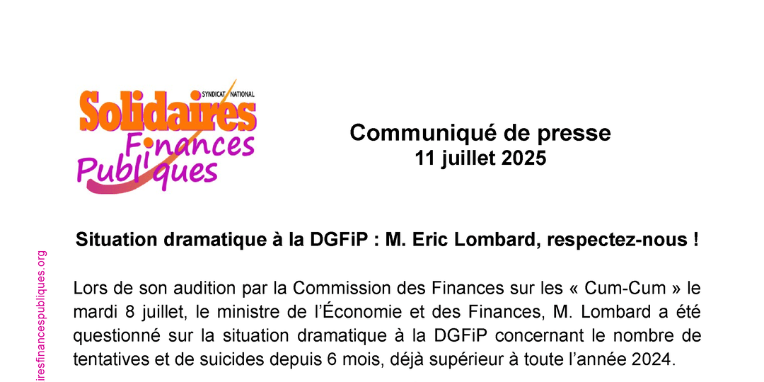 Lors de son audition par la Commission des Finances sur les « Cum-Cum » le mardi 8 juillet, le ministre de l’Économie et des Finances, M. Lombard a été questionné sur la situation dramatique à la DGFiP concernant le nombre de tentatives et de suicides depuis 6 mois, déjà supérieur à toute l’année 2024.