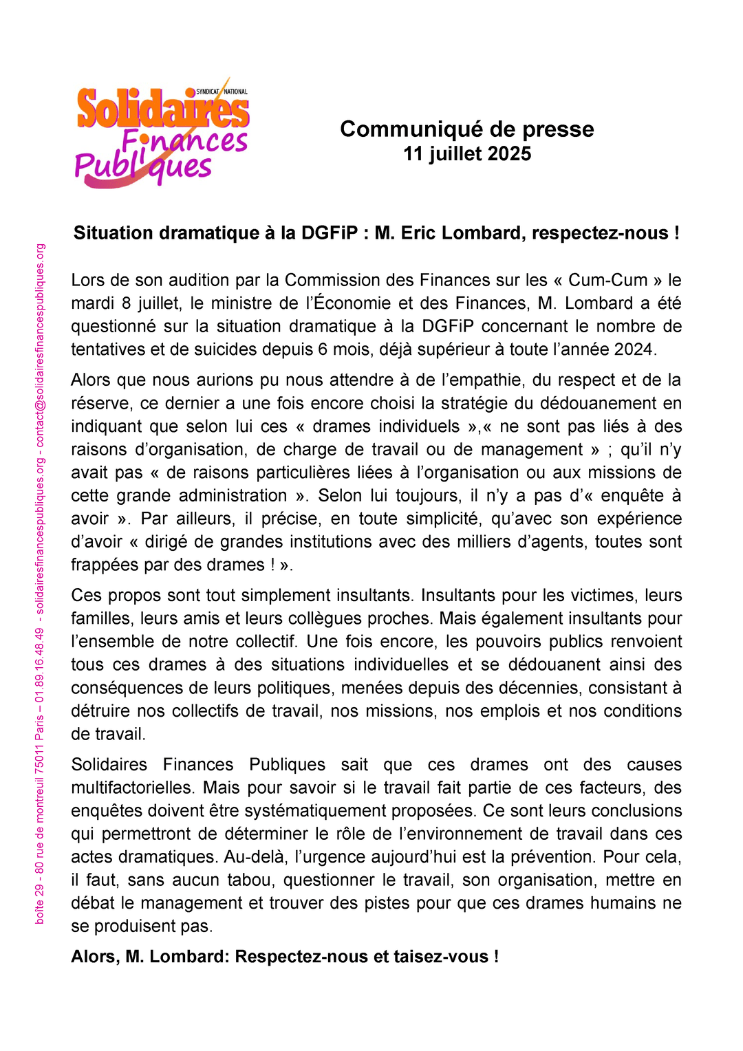Situation dramatique à la DGFiP : M.Eric Lombard, respectez-nous !