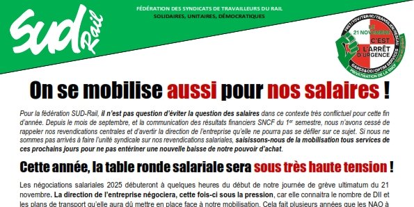 Pour la fédération SUD-Rail, il n’est pas question d’éviter la question des salaires dans ce contexte très conflictuel pour cette fin d’année.