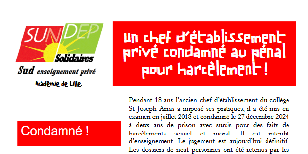 Pendant 18 ans l’ancien chef d’établissement du collège St Joseph Arras a imposé ses pratiques, il a été mis en examen en juillet 2018 et condamné le 27 décembre 2024 à deux ans de prison avec sursis pour des faits de harcèlements sexuel et moral. Le jugement est