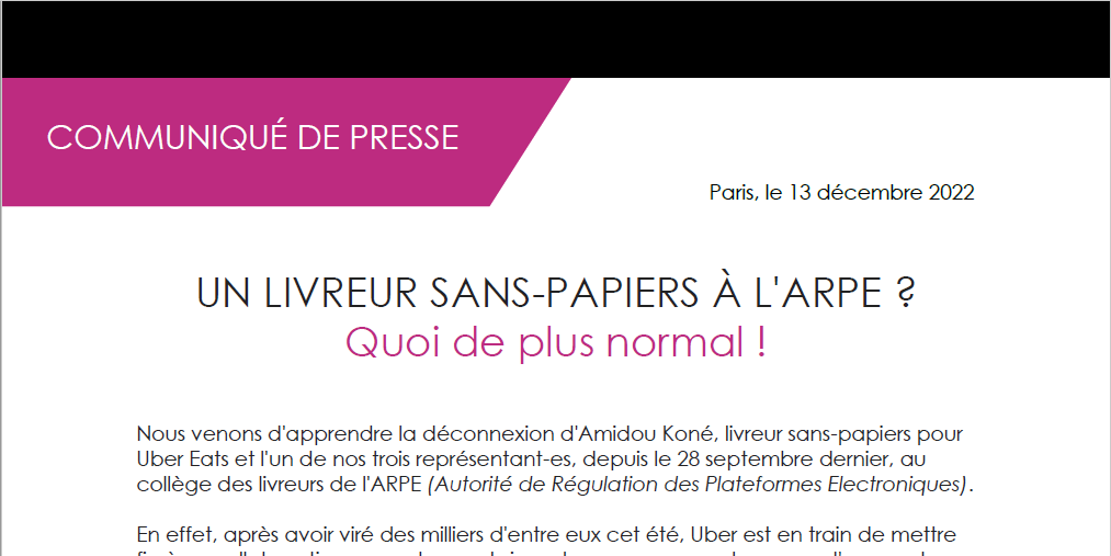 Nous venons d'apprendre la déconnexion d'Amidou Koné, livreur sans-papiers pour Uber Eats et l'un de nos trois représentant-es, depuis le 28 septembre dernier, au collège des livreurs de l'ARPE (Autorité de Régulation des Plateformes Electroniques).