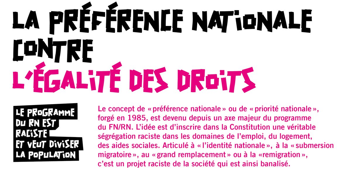 Le concept de “ préférence nationale ” ou de “ priorité nationale ”, forgé en 1985, est devenu depuis un axe majeur du programme du FN / RN. L’idée est d’inscrire dans la Constitution une véritable ségrégation raciste dans les domaines de l’emploi, du logement, des aides sociales. Articulé à “ l’identité nationale ”, à la “ submersion migratoire ”, au “ grand remplacement ” ou à la “ remigration ”, c’est un projet raciste de la société qui est ainsi banalisé.