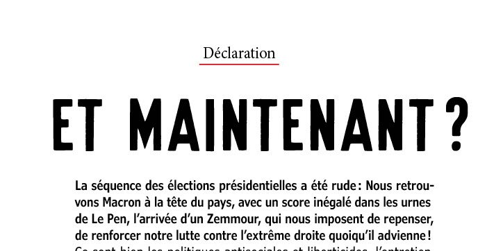 Nous retrouvons Macron à la tête du pays, avec un score inégalé dans les urnes de Le Pen, l’arrivée d’un Zemmour, qui nous imposent de repenser, de renforcer notre lutte contre l’extrême droite quoiqu’il advienne!! Ce sont bien les politiques antisociales et liberticides, l’entretien des peurs et des haines, la désespérance, qui renforcent l’extrême droite. Nos luttes, encore plus si elles sont victorieuses, les feront reculer. Nous n’attendrons pas une forte aggravation, comme l’ont connu les habitant-es de la Hongrie ou du Brésil.
