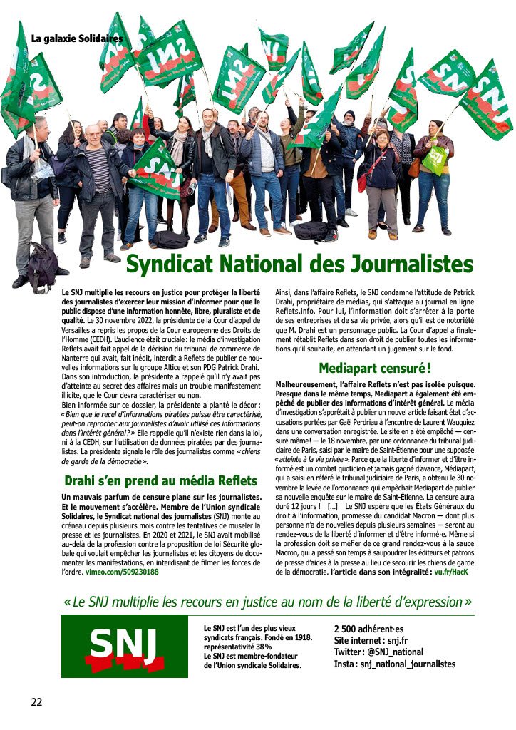 Ainsi, dans l’affaire Reflets, le SNJ condamne l’attitude de Patrick Drahi, propriétaire de médias, qui s’attaque au journal en ligne Reflets.info.