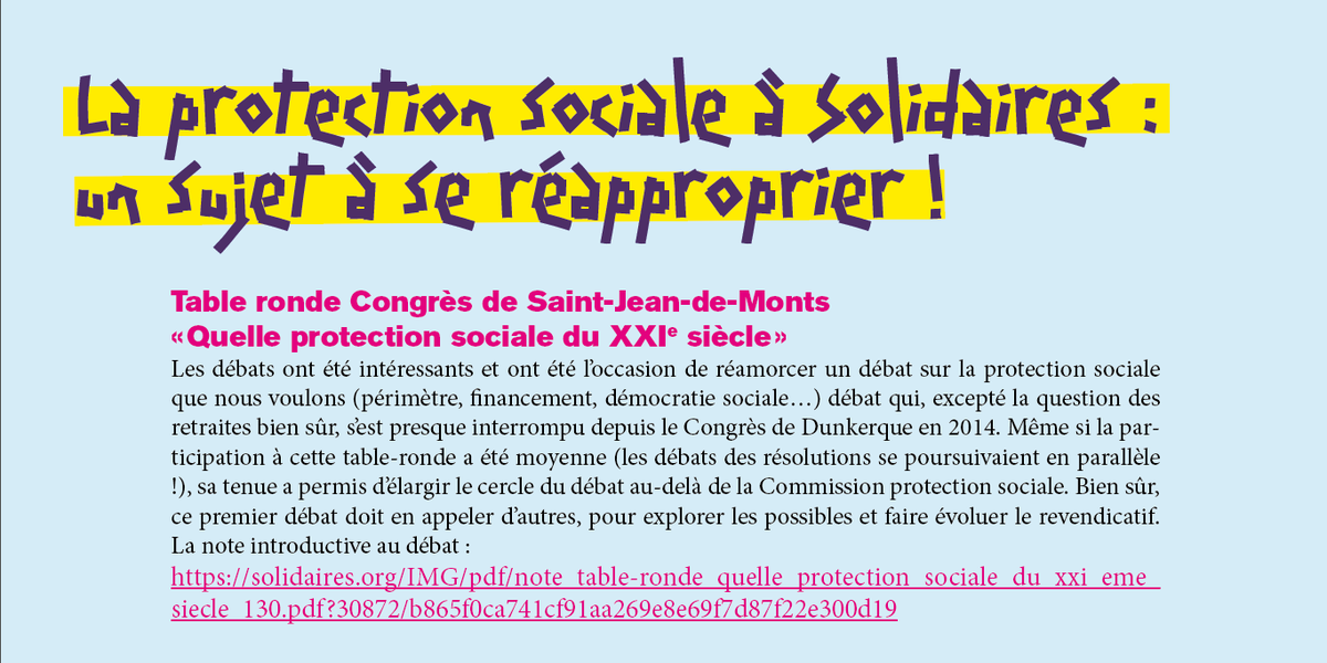 Les débats ont été intéressants et ont été l’occasion de réamorcer un débat sur la protection sociale que nous voulons (périmètre, financement, démocratie sociale…) débat qui, excepté la question des retraites bien sûr, s’est presque interrompu depuis le Congrès de Dunkerque en 2014. Même si la participation à cette table-ronde a été moyenne (leas débats des résolutions se poursuivaient en parallèle !), sa tenue a permis d’élargir le cercle du débat au-delà de la Commission protection sociale. Bien sûr, ce premier débat doit en appeler d’autres, pour explorer les possibles et faire évoluer le revendicatif.