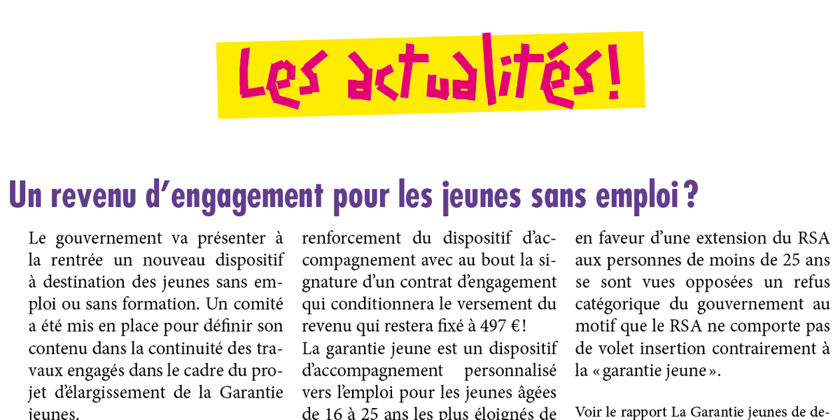 Les principes du nouveau dispositif ne devraient pas être très différents du précédent : élargissement des conditions d’accès par rapport à la « garantie jeunes » existante et renforcement du dispositif d’accompagnement avec au bout la signature d’un contrat d’engagement qui conditionnera le versement du revenu qui restera fixé à 497 € !