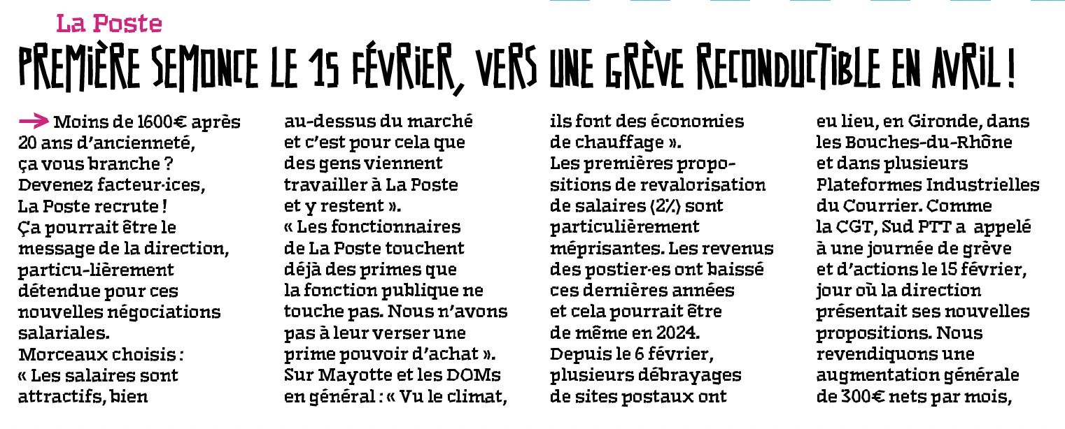 Cette première journée était un point d’appui pour construire et élargir la mobilisation, y compris en intersyndicale, vers une grève reconductible à partir du 2 avril. Nous continuerons à marteler qu’il faut en finir avec l’austérité salariale, la dégradation des conditions de travail et les suppressions d’emplois. En deux ans, 15 500 emplois ont été supprimés. S’attaquer aux conditions de travail des postier·es c’est aussi s’attaquer au service public postal. Moins de postier·es c’est moins de tournées de facteur·ices et moins de bureaux de Poste. Aujourd’hui il reste moins de 7700 bureaux, contre plus de 16 000 il y a 20 ans !