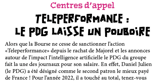 Alors que la Bourse ne cesse de sanctionner l’action «Teleperformance» depuis le rachat de Majorel et les annonces autour de l’impact l’intelligence artificielle le PDG du groupe fait la une des journaux pour son salaire. En effet, Daniel Julien (le PDG) a été désigné comme le second patron le mieux payé de France ! Pour l’année 2022, il a touché au total, tenez-vous bien, 19,7 millions d’euros ! Le patron du leader mondial des centres d’appels est d’ailleurs, parmi les dirigeants du CAC 40, celui dont l’écart de rémunération avec ses salarié.e.s est le plus élevé, selon Proxinvest. Il aurait gagné 1 453 fois plus que le salaire moyen de son entreprise en 2022 !