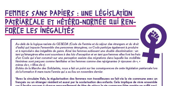 Au-delà de la logique raciste du CESEDA (Code de l'entrée et du séjour des étrangers et du droit d'asile) qui impacte l’ensemble des personnes étrangères, ce Code participe également à produire et à reproduire des inégalités de genre. Ainsi les femmes subissent une double discrimination : en tant qu’étrangères elles sont soumises à des lois d’exception et en tant que femmes elles font les frais d’un Code qui s’est construit sur une perception sexiste des migrations dans laquelle les mobilités féminines sont perçues comme familiales et les femmes comme des rejoignantes (« épouses de », « mères de », « filles de »). Bchira de la Marche des Solidarités, nous a fait un point sur les conséquences de cette législation patriarcale lors de la formation 8 mars toute l'année qui a eu lieu en novembre dernier.