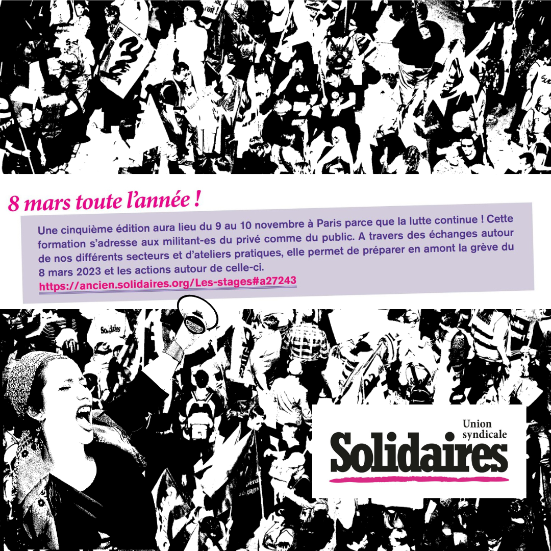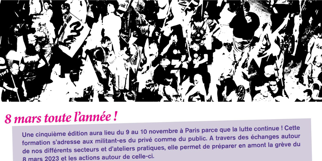 Une cinquième édition aura lieu du 9 au 10 novembre à Paris parce que la lutte continue ! Cette formation s’adresse aux militant-es du privé comme du public. A travers des échanges autour de nos différents secteurs et d’ateliers pratiques, elle permet de préparer en amont la grève du 8 mars 2023 et les actions autour de celle-ci. https://ancien.solidaires.org/Les-stages#a27243