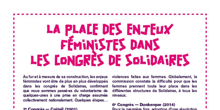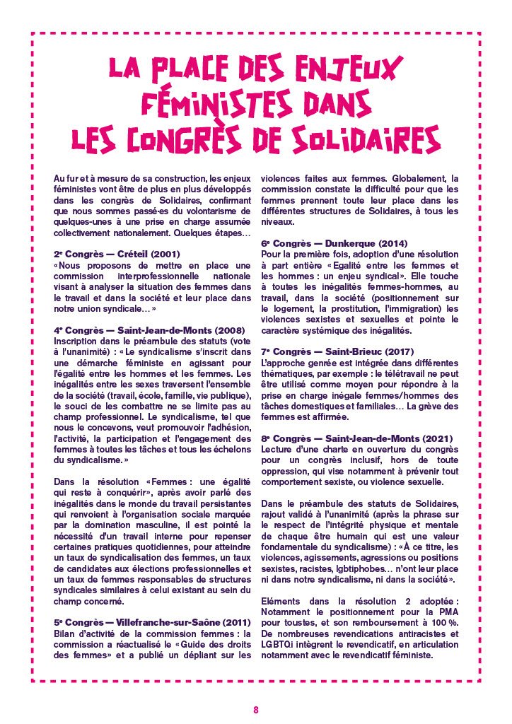 Au fur et à mesure de sa construction, les enjeux féministes vont être de plus en plus développés dans les congrès de Solidaires, confirmant que nous sommes passé·es du volontarisme de quelques unes à une prise en charge assumée collectivement nationalement. Quelques étapes…